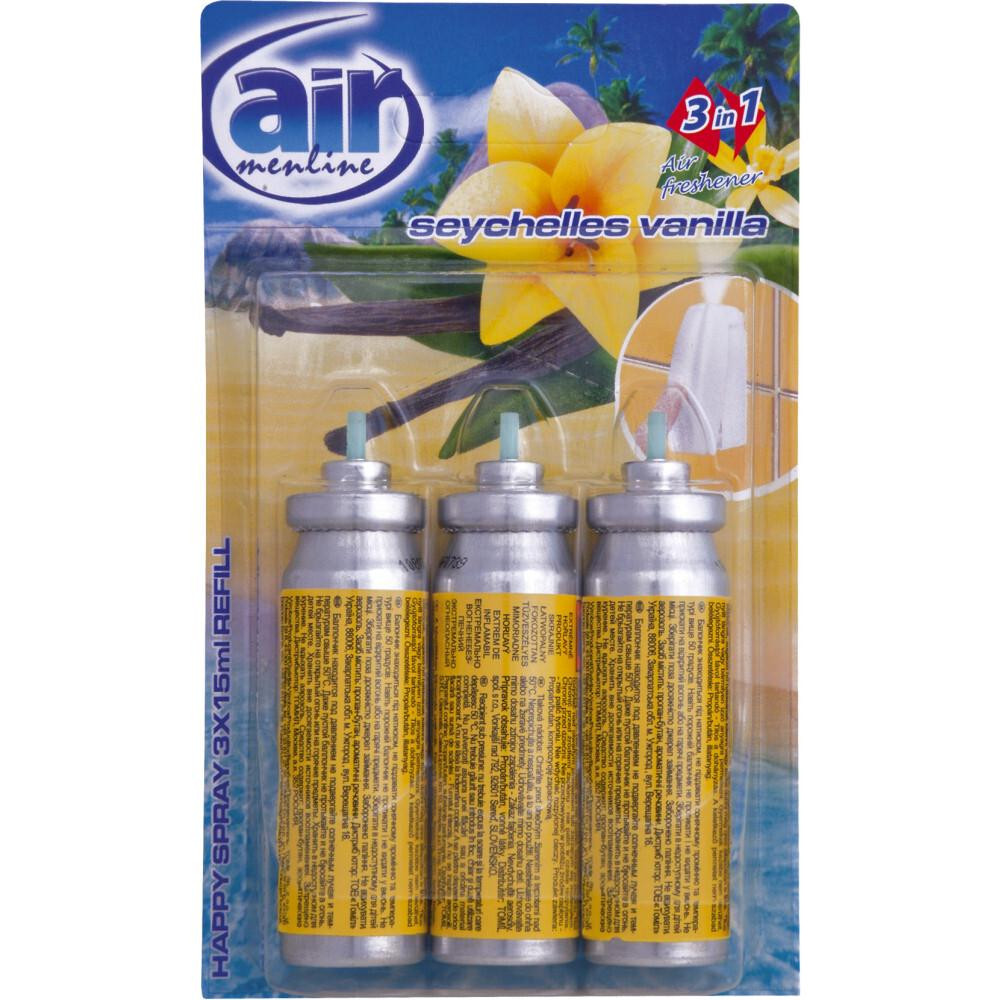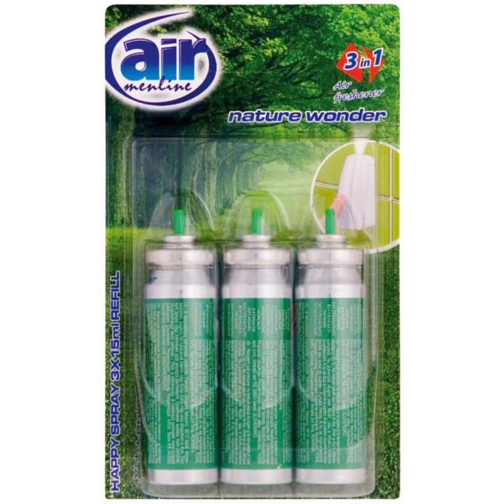 AIR 3V1 SPREJ NÁHRADNÉ NÁPLNE 3X15 ML Rozprašovač Menline spray neutralizuje zápach a zanecháva sviežu vôňu.