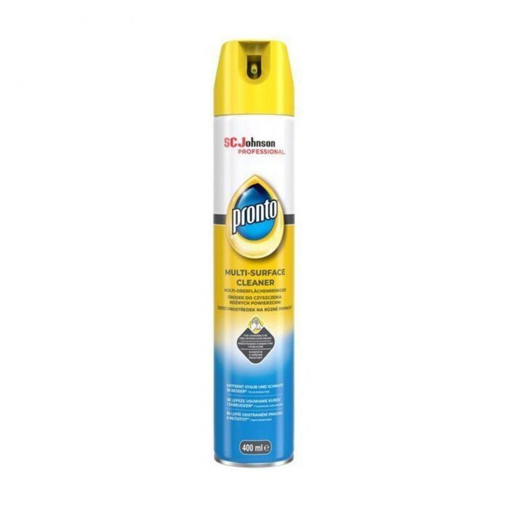 Pronto multifunkčný sprej s vôňou jazmínu dokonale odstraňuje prach, šmuhy a odtlačky. Obsahuje antistatické zložky , ktoré zabraňujú opätovnému usadzovaniu prachu. Jemne čistí a odstraňuje prach z kovu, dreva, skla a elektroniky (okrem plazmových/LCD obrazoviek). Nie je vhodný na použitie na drevo bez povrchovej úpravy. Pronto poskytuje vášmu nábytku dokonalú starostlivosť a ochranu.