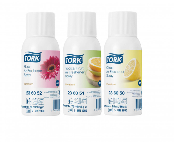 Spreje obsahujú vonné oleje a patentovanú zložku neutralizujúcu zápachy na elimináciu nepríjemných zápachov, a zároveň poskytujú dlhotrvajúci pocit čerstvého vzduchu. Spreje sú vhodné do Tork elektronického osviežovača vzduchu.